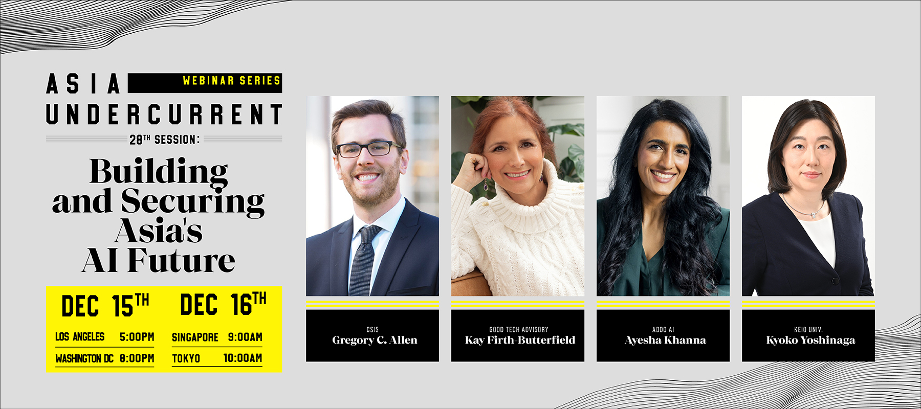 Our expert panel of AI professionals convenes to explore these questions further, and will be moderated by Mr. Gregory C. Allen (Senior Adviser, Wadhwani AI Center, Center for Strategic and International Studies [CSIS]) and feature Dr. Kay Firth-Butterfield (CEO of Good Tech Advisory, former Head of Artificial Intelligence & Quantum and member of the Executive Committee at the World Economic Forum), Dr. Ayesha Khanna (CEO and Co-Founder, Addo AI), and Prof. Kyoko Yoshinaga (Project Associate Professor of the Graduate School of Media and Governance, Keio University).
